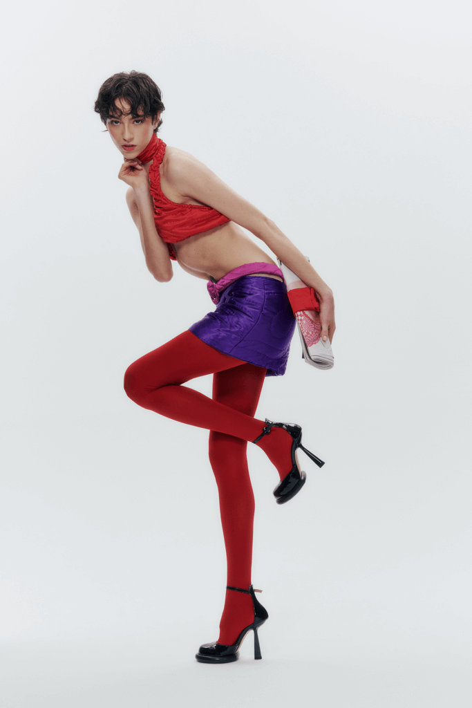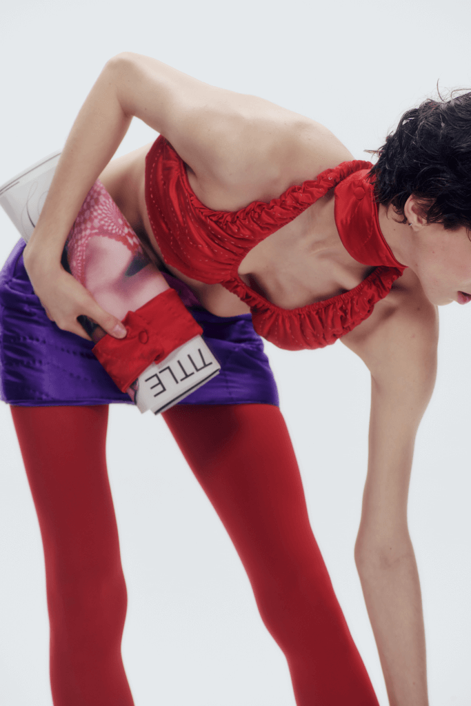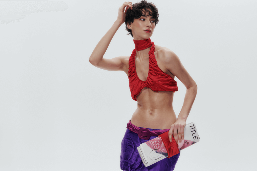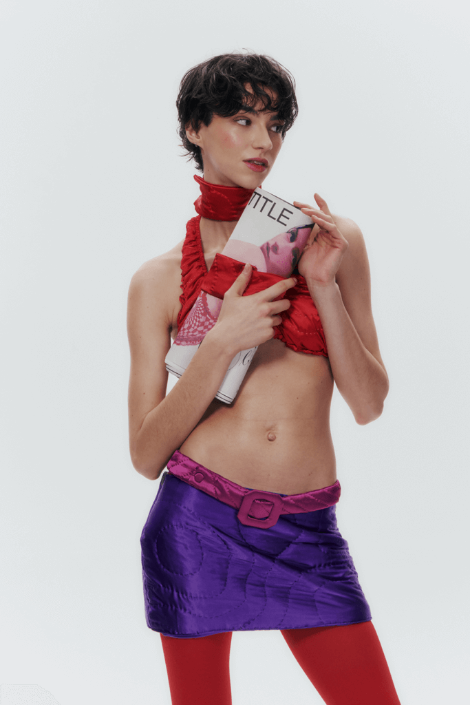 “The red quilted belts we designed feature the unique texture that defines our brand: hand-stitched quilting crafted by our artisans. For this project, we complemented the magazine’s aesthetic by incorporating abstract stitch details that harmonise with its visual tone.”